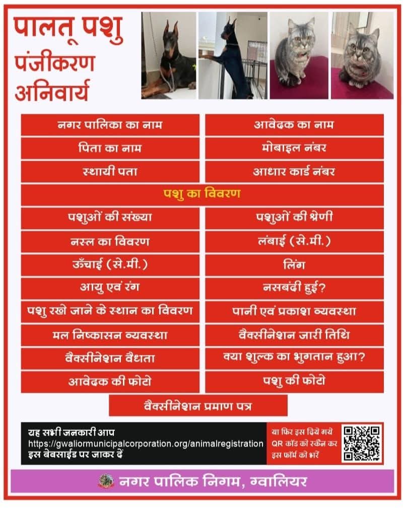 नगर निगम ग्वालियर ने समस्त पालतू पशु पालकों से अनुरोध किया है कि वे समय पर पंजीयन कराकर नियमानुसार सहयोग प्रदान करें।