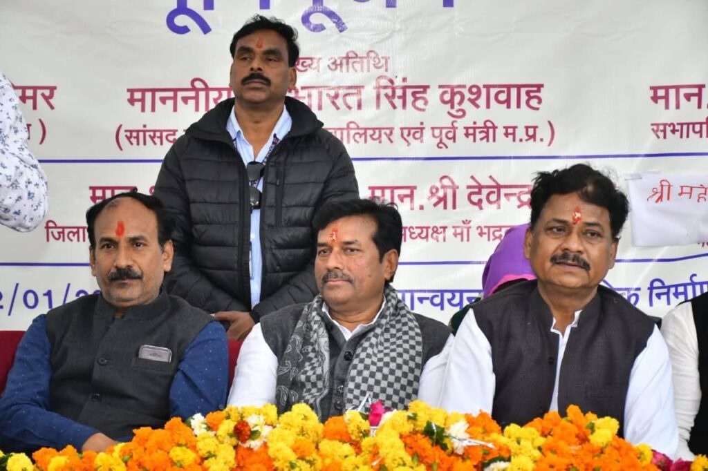 ग्वालियर दिनांक – सांसद भारत सिंह कुशवाह ने आज शुक्रवार को ग्वालियर के वार्ड क्रमांक 30 स्थित टैगोर नगर की विभिन्न गलियों में 47 लाख रुपए की लागत से बनने वाली सी.सी. सड़क निर्माण कार्य एवं वार्ड क्र. 09 के लधेड़ी में 9.23 लाख रूपये की लागत से बनने वाली केवट बगीचे की बाउंड्रीवॉल के निर्माण कार्य का भूमिपूजन किया। इस अवसर पर सभापति श्री मनोज तोमर, क्षेत्रीय पार्षद श्रीमती रेखा त्रिपाठी, श्रीमती अनीता रामू कुशवाह, पार्षद श्री दीपक मांझी, सहित वरिष्ठ नागरिकगण उपस्थित रहें।