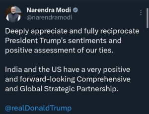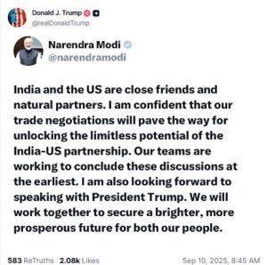 “भारत और अमेरिका नेचुरल पार्टनर हैं। हमारी टीमें लगातार ट्रेड नेगोशिएशन पर काम कर रही हैं। मुझे भरोसा है कि बातचीत दोनों देशों के लिए बेहतर भविष्य का रास्ता खोलेगी। मैं राष्ट्रपति ट्रम्प से बातचीत का इंतजार कर रहा हूं।”
